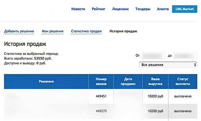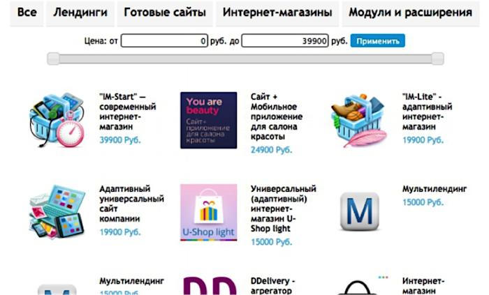 Кроме тендерного раздела, мы также научились отдавать на сторону и UMI.Market. Это позволяет любой сторонней компании организовать у себя каталог готовых «коробочных» сайтов.