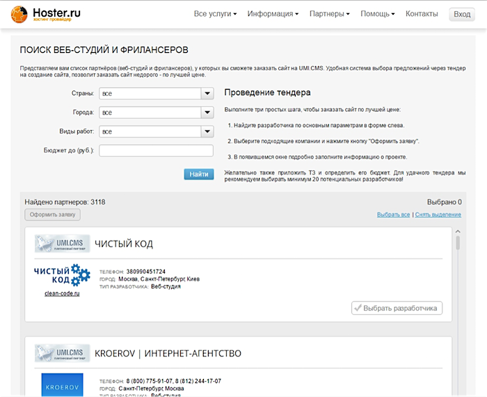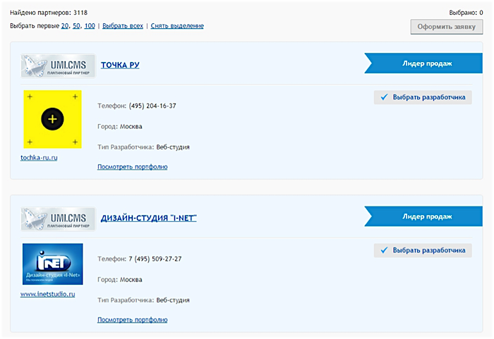 Раздел «заказать сайт» (тендерный раздел) служит не только для оформления заявок, оттуда ещё звонят клиенты :) Наша задача — завалить интернет нашими партнёрами. Мы научились отдавать тендерную площадку UMI.CMS на сторону. Получается, каждая компания может разместить у себя на сайте всегда актуальный «живой» список подрядчиков на web-услуги.