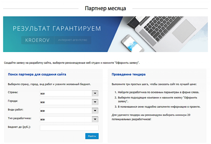 - Клиент имеет возможность организовать тендер и найти наиболее подходящее для себя предложение по сроками и деньгам. Конечно, речь идёт не только о разработке сайтов, но и рекламе, SEO и т.д.