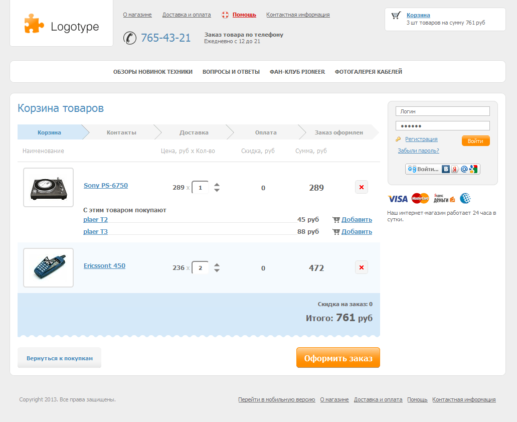 Новый интерфейс корзины разработан с учетом современных канонов юзабилити в электронной коммерции, которым мы всегда советуем следовать для достижения максимальной конверсии интернет-магазина. Со страницы корзины убраны все лишние блоки (социальные сети, новости, баннеры и т.п.), чтобы не отвлекать внимание клиента от процесса оформления заказа. В обновленной корзине появилась возможность добавить к заказу сопутствующие товары, не покидая корзину. Рядом с каждым выбранным товаром в корзине теперь выводится его изображение. Реализован механизм оформления заказа по шагам, а также встроен функционал для ускоренного оформления заказа, что делает процесс покупки в интернет-магазине простым и понятным.