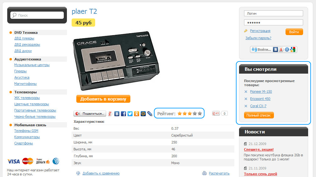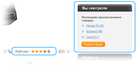 Еще один важный инструмент повышения эффективности интернет-магазина — функционал «недавно просмотренные товары и страницы». Система автоматически запоминает страницы, которые посетил пользователь (разделы, товары, новости и др.), и позволяет выводить их в виде списков. Теперь посетителям сайта будет намного проще осуществлять навигацию по сайту и возвращаться к недавно просмотренным страницам.