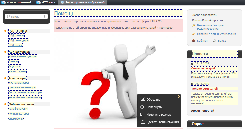 Мы постоянно развиваем и улучшаем Edit-In-Place. Так, в релиз 2.9.6 добавлен редактор изображений, который позволяет выполнять простейшие операции с картинками и фото прямо на страницах сайта. Вам больше не нужно использовать сторонние программы для адаптирования картинки под веб-страницу, с помощью редактора изображений вы можете сколько угодно работать с ней и мгновенно оценивать результат.