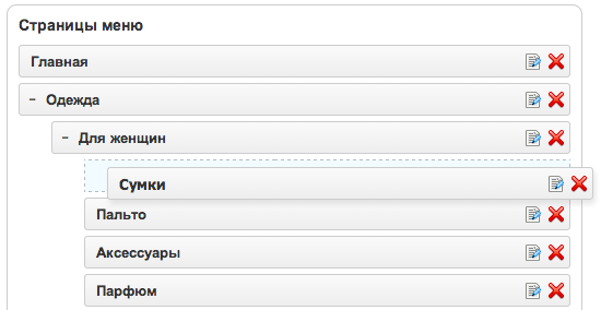 Модуль управления меню сайта позволяет добавлять, перемещать и изменять его пункты; поддерживает создание любого количества меню с повторяющимися элементами (верхнее, нижнее, основное и др.); позволяет добавлять пункты с внешними ссылками и ставить ссылки на системные страницы (например, на «Корзину» или страницу регистрации).