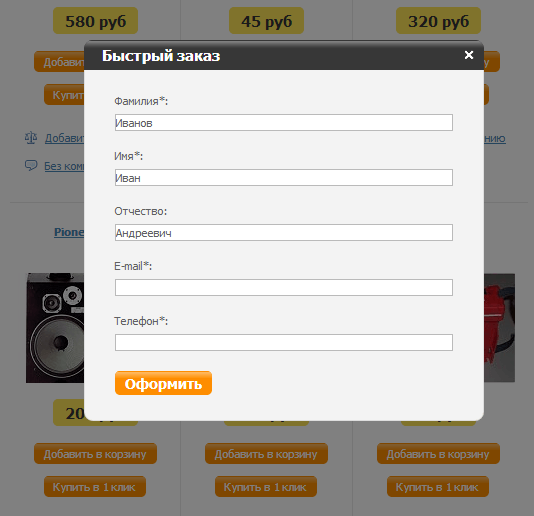 Функция «заказа в один клик» актуальна для небольших магазинов — менеджер сам может настроить минимальный набор полей, которые нужно заполнить покупателю. Это гарантированно повышает конверсию магазина, так как большинство отказов на сайтах малого бизнеса связаны именно с несоразмерно долгим процессом оформления заказа.