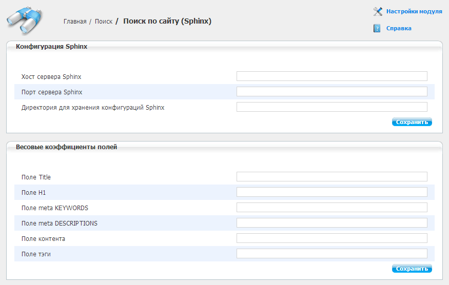 В версию 2.9.6 добавлена поддержка поисковой системы Sphinx. Для пользователей UMI.CMS переход на нее предельно прост — нужно указать в настройках модуля «Поиск», что будет использоваться Sphinx, и выбрать хост и порт, где запущен демон. Для удобства начальная конфигурация весов базовых полей осуществляется прямо в админке, при желании можно добавить в индекс кастомные поля и определить весовые коэффициенты.