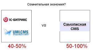 Это и понятно: самописная CMS «лежит на полке», развивается, как правило, стихийно, без выделения бюджетов, в лучшем случае,улучшаясь от проекта к проекту. «Продали CMS за 20? Замечательно! За 15? Ну, нормально... За 10? Ну, не бесплатно же отдали, и то хорошо...Что в этот раз совсем не удаётся втиснуть её в смету? Ну давай размажем» — встречается и такое. Учитывая, что в кризис клиенты воспринимают скидку как нечто должное, а давать её безболезненно можно только засчёт самописной CMS, становится ясно, что потери в её стоимости составляют до 100%, а в случае продажи коробочной СМS — мы «теряем» не более 50%.