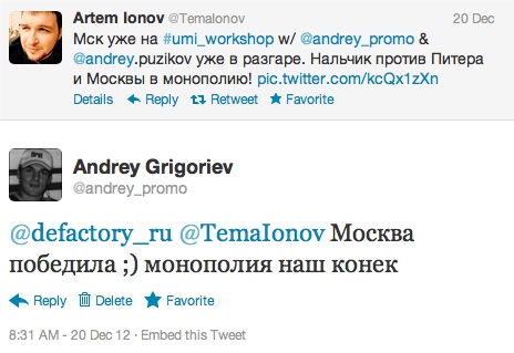 Мы решили привезти дух московских воркшопов. Мой UMI.Workshop начался еще в Сапсане в душевных разговорах и за игрой в монополию, в компании Андрея Пузикова и Андрея Григорьева. Я был рад познакомиться с сотрудниками UMI и с офисом лично, послушать очень интересный доклад от Андрея Григорьева, который еще заставил нас всех «похрюкать». Все было очень позитивно, в лучших традициях Москвоских UMI.Workshop. Очень рад, что выбрался из Москвы, познакомился с новыми интересными людьми. Было очень тепло и по-домашнему!"