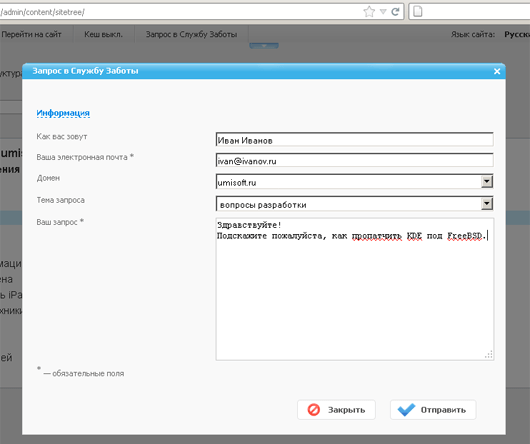 Написать в поддержку UMI.CMS теперь можно прямо из «админки» сайта (кнопка в верхней панели). При этом нет необходимости искать лицензионный ключ и т.д. — в форме все необходимые поля уже заполнены за вас.