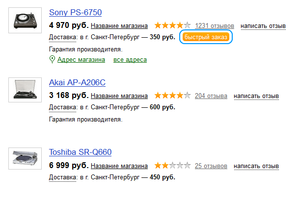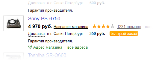 В описание товара интернет-магазина, подключеного к «Быстрому заказу», добавляется специальный значок «быстрый заказ». Товары с таким значком показываются выше других предложений при прочих равных условиях.